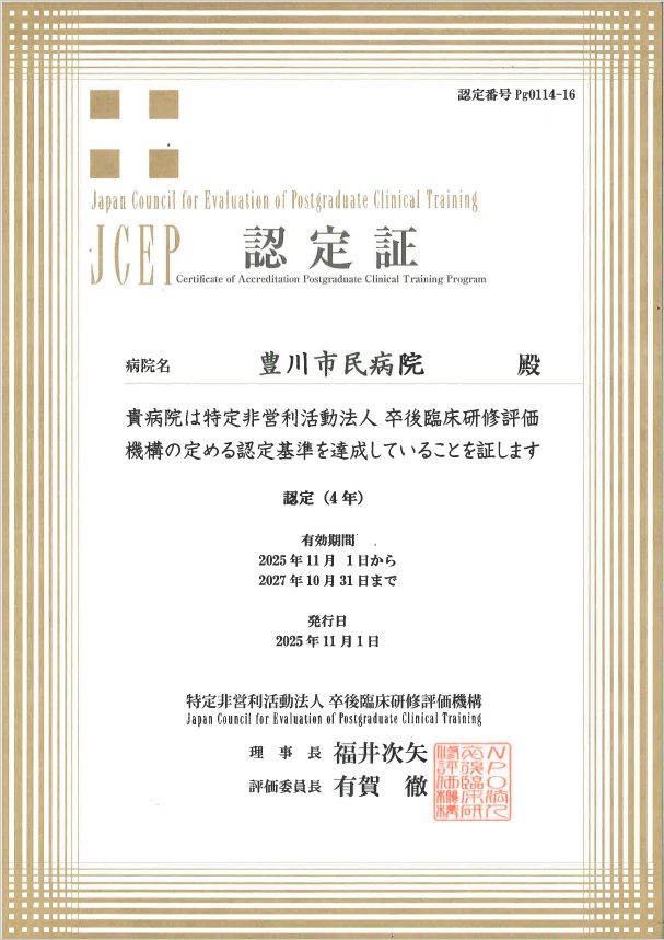 当院では、平成元年4月に厚生労働省より臨床研修病院の指定を受け、研修医の育成に努めて参りましたが、研修内容の向上を図る取り組みとして、NPO法人卒後臨床研修評価機構が実施する臨床研修評価を受審し、2011年11月1日付けで県下の公立病院としては、第1号となる認定を受けることができました